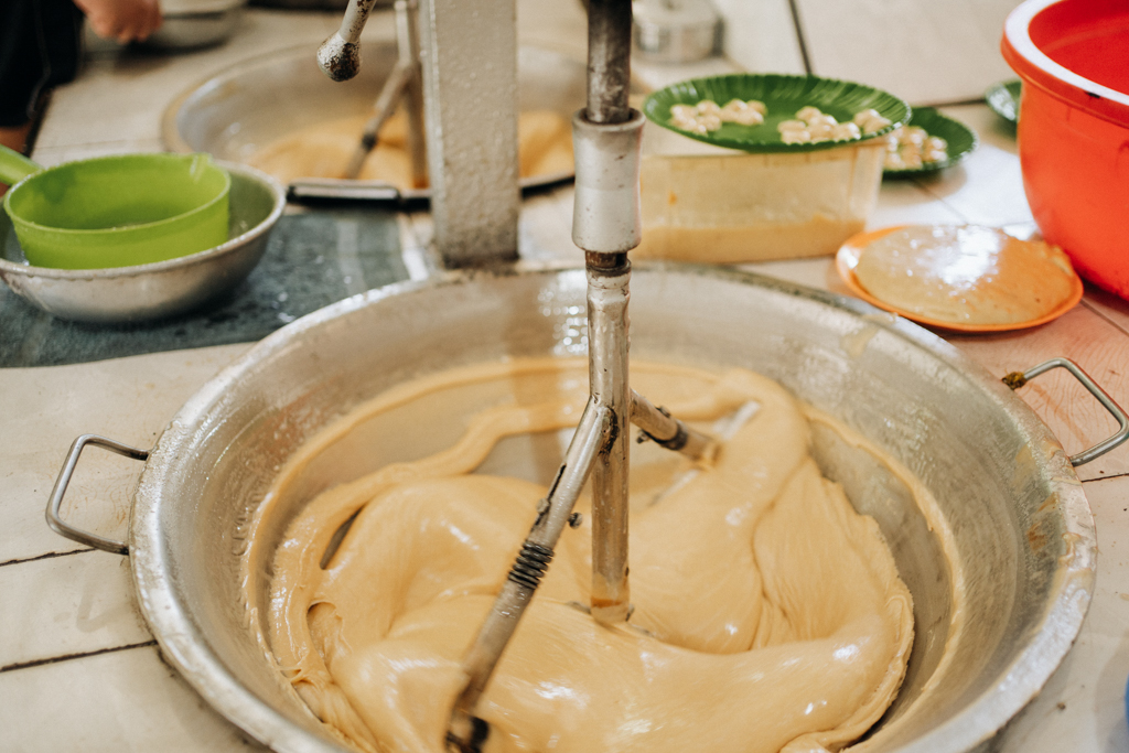 Über dem heissen Ofen wird Kokosmilch mit Zucker vermengt und kräftig gerührt. Der Motor des Rührgeräts läuft und rattert den ganzen Tag. Sobald die flüssige Masse in den festen Zustand gerührt ist, wird sie dann auf ein Blech verteilt. Auf dem Blech sind schmale Rillen gestanzt. Da entsteht dann ein ewig langer, dünner Kokos-Bonbon-Streifen. Sobald der hart ist, kommt er raus und wird in immer gleiche Teile geschnitten.